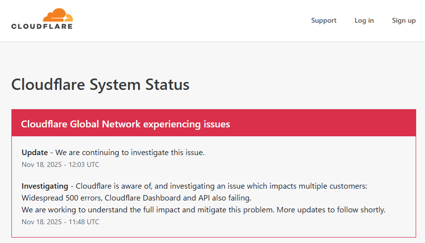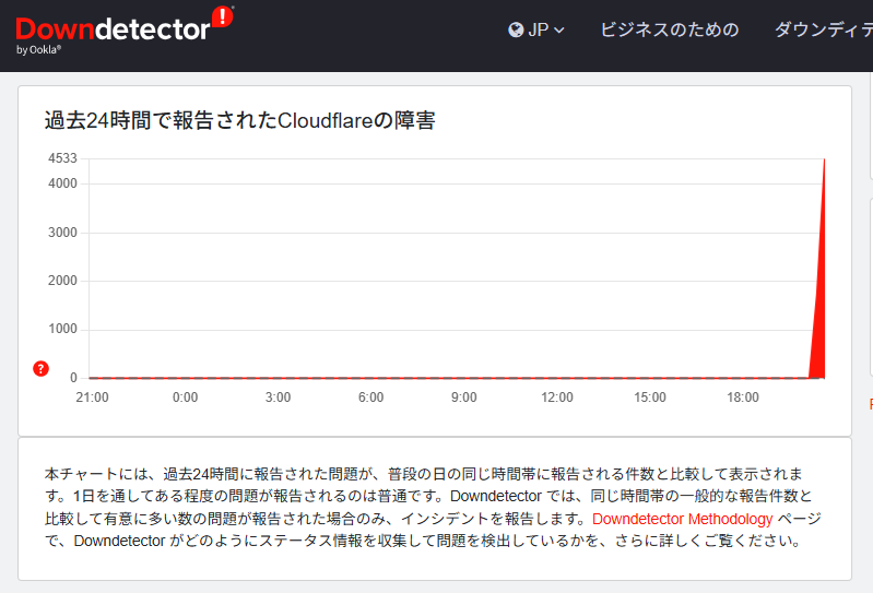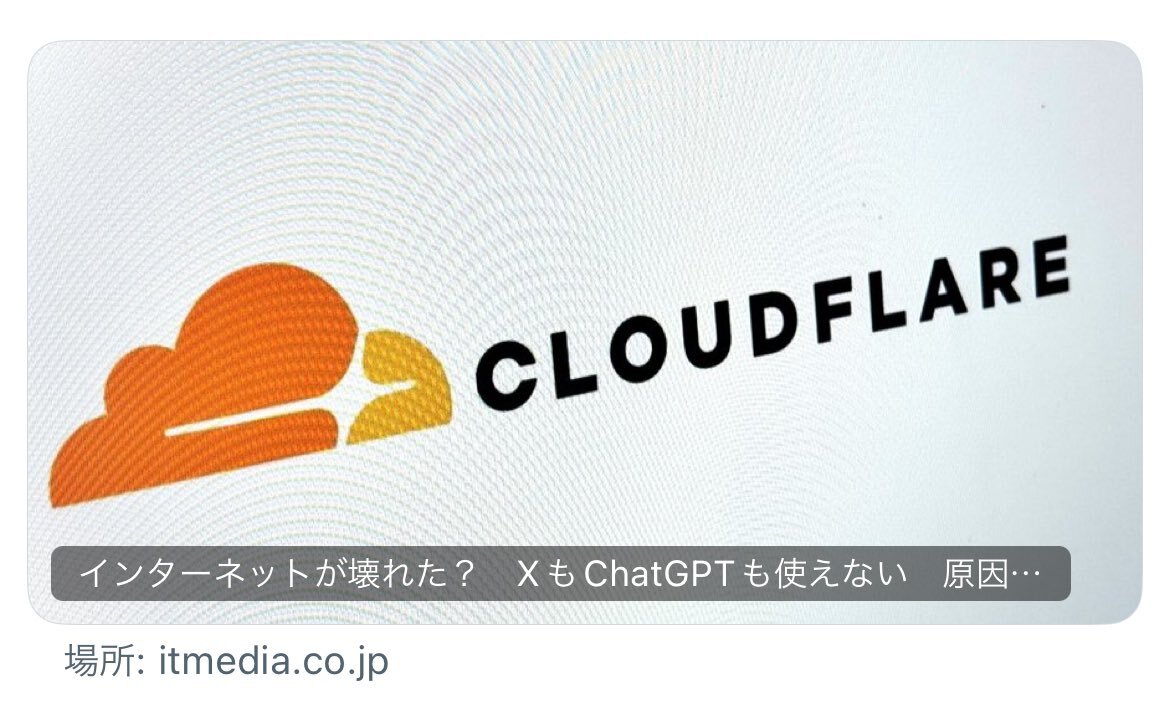 まさに「インターネット壊れた」状態。 Twitterくん(別名:X)が落ちているというよりは、間のCloudFlareで大規模障害が起きているみたいですね。 グローバルネットワークに問題が発生して、原因は調査中とのこと。Downdetectorを見ると他も急速に不具合報告が増えているようです。 pic.x.com/RlxqA8S0fJ