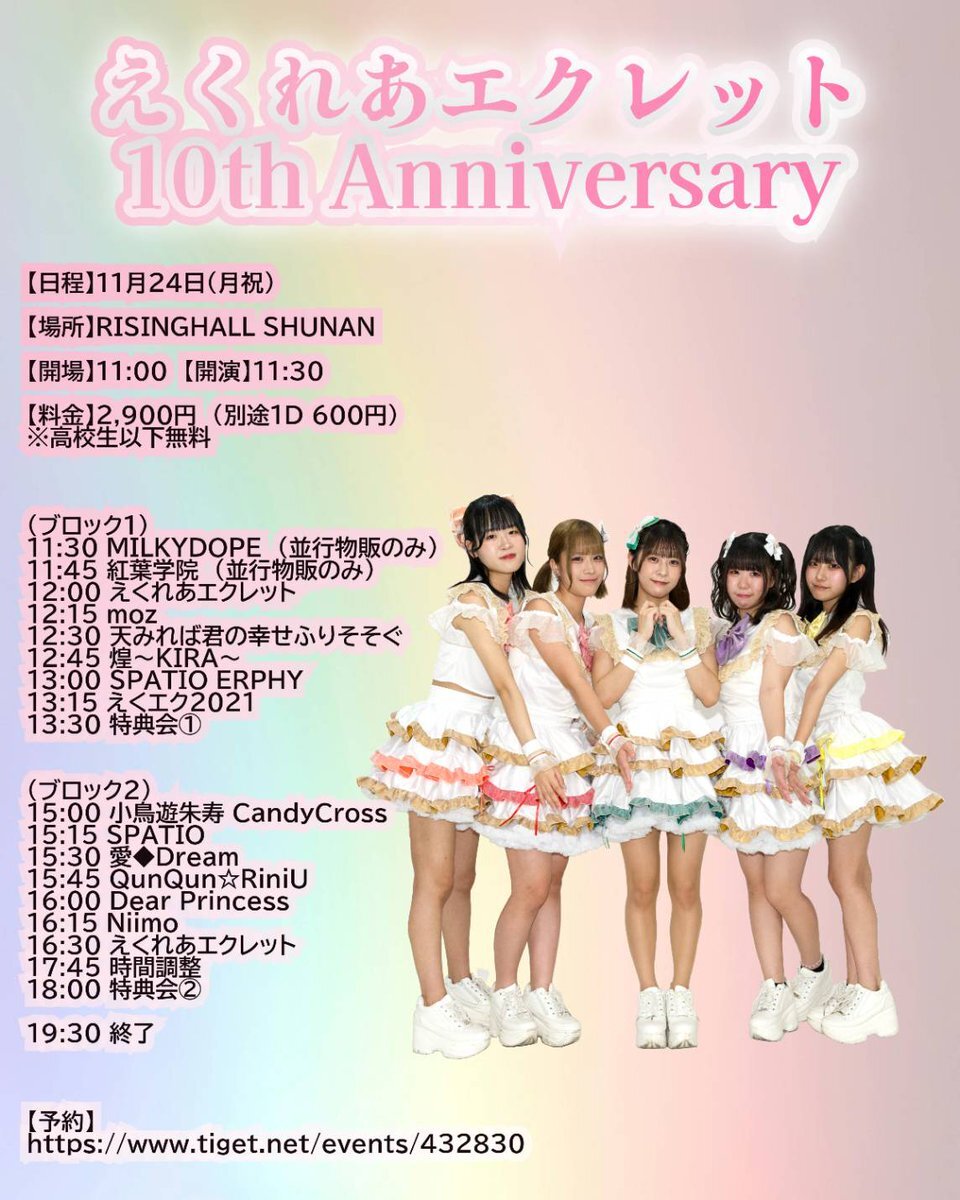 11/24「えくれあエクレット10th Anniversary」 【場所】RISINGHALL SHUNAN 【開場】11:00【開演】11:30 【料金】2,900円(別途1D) 【予約】受付中 ◇TIGET tiget.net/events/432830 #えくエク10thAnniversary 👕えくれあエクレット10周年記念Tシャツ販売中 market.up-t.jp/creator/68f245…