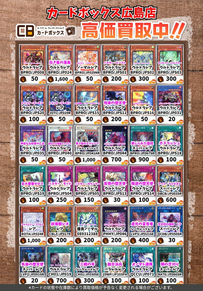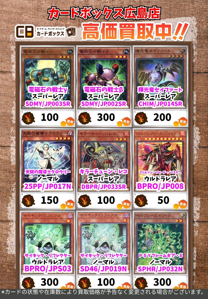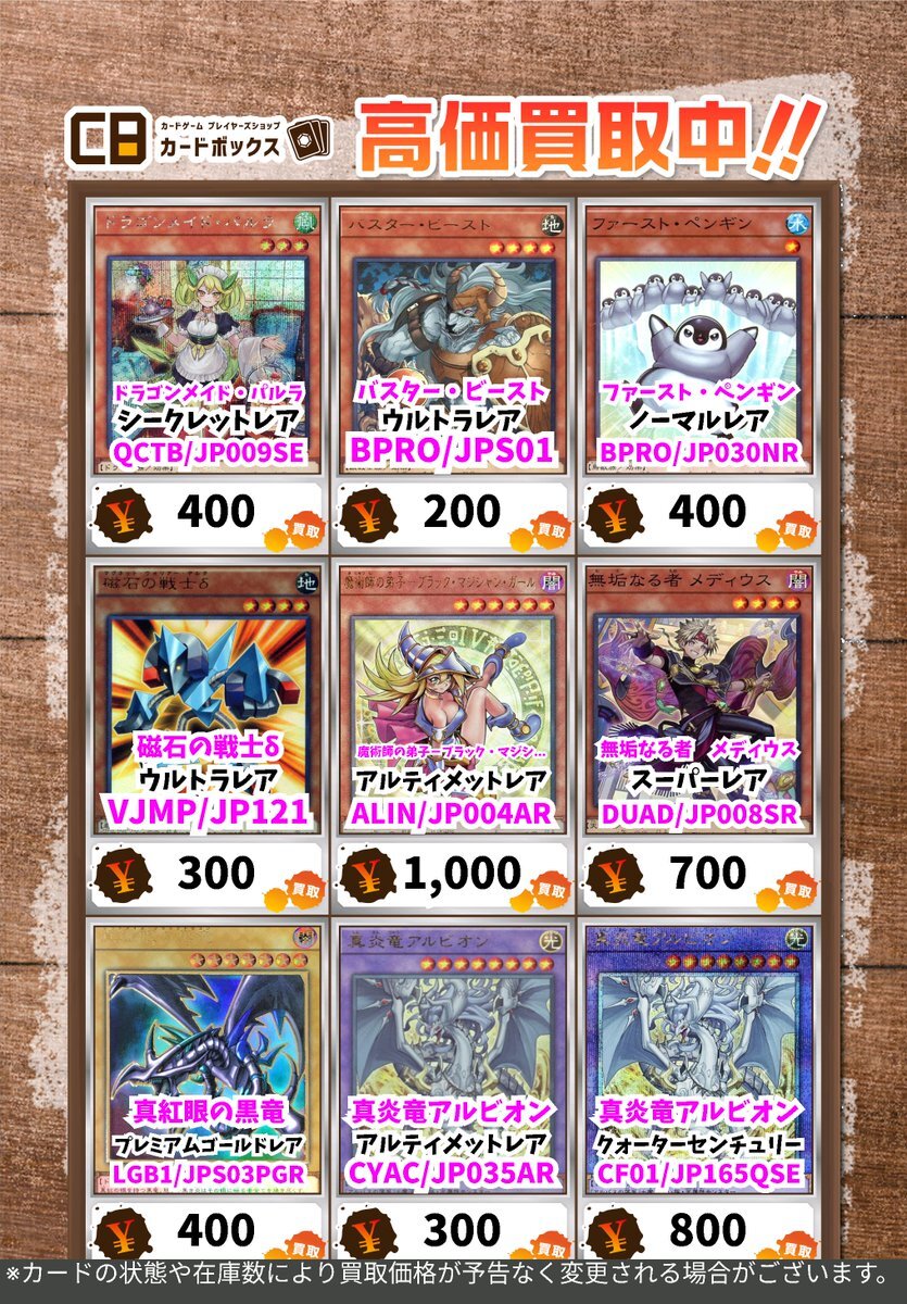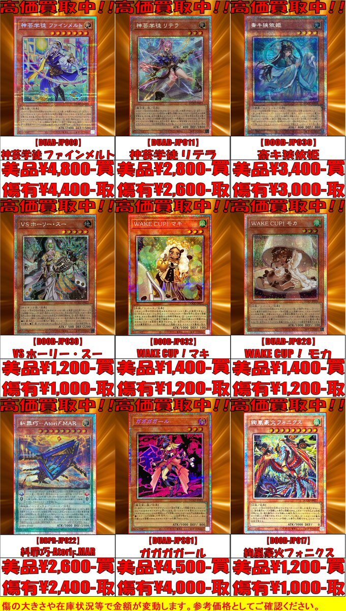 遊戯王 プリズマ買取更新 神芸学徒 ファインメルト 美品¥4,800 傷有¥4,400 神芸学徒 リテラ 美品¥2,800 傷有¥2,600 斎キ狭依姫 美品¥3,400 傷有¥3,000 WAKE CUP!マキ 美品¥1,400 傷有¥1,200 WAKE CUP!モカ 美品¥1,400 傷有¥1,200 ガガガガール 美品¥4,500 傷有¥4,000 193大須店にお願いします(^^♪ pic.x.com/zXX5dTb3r6