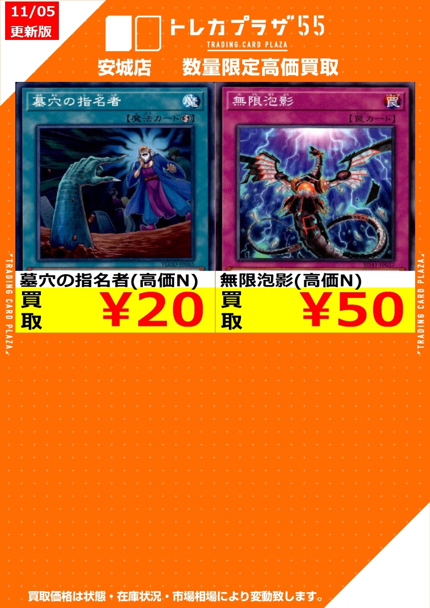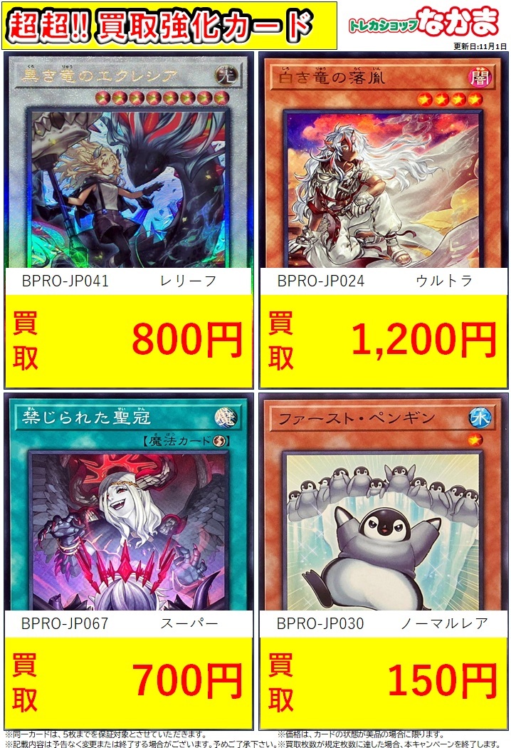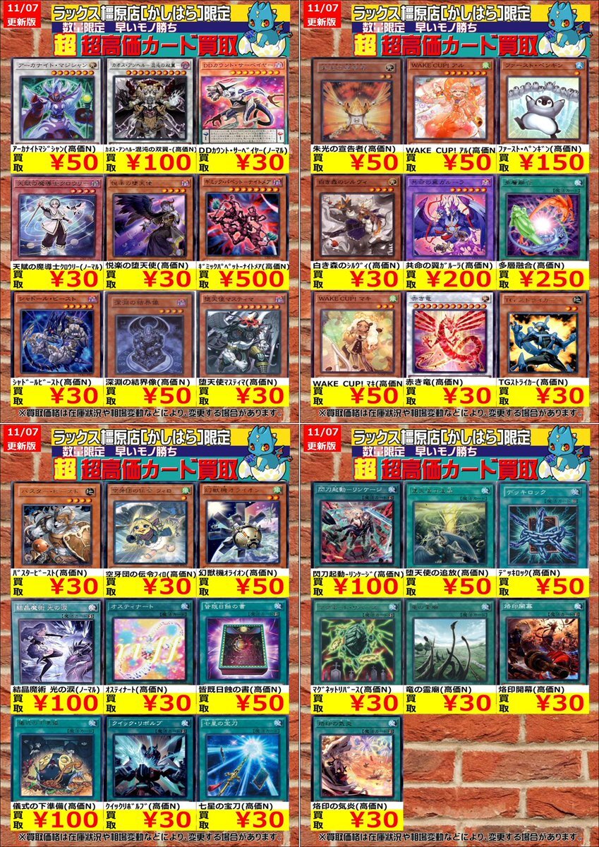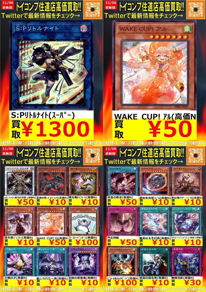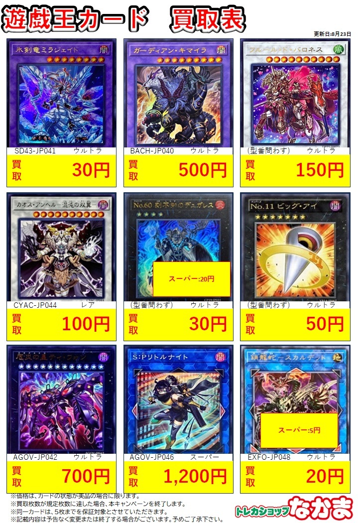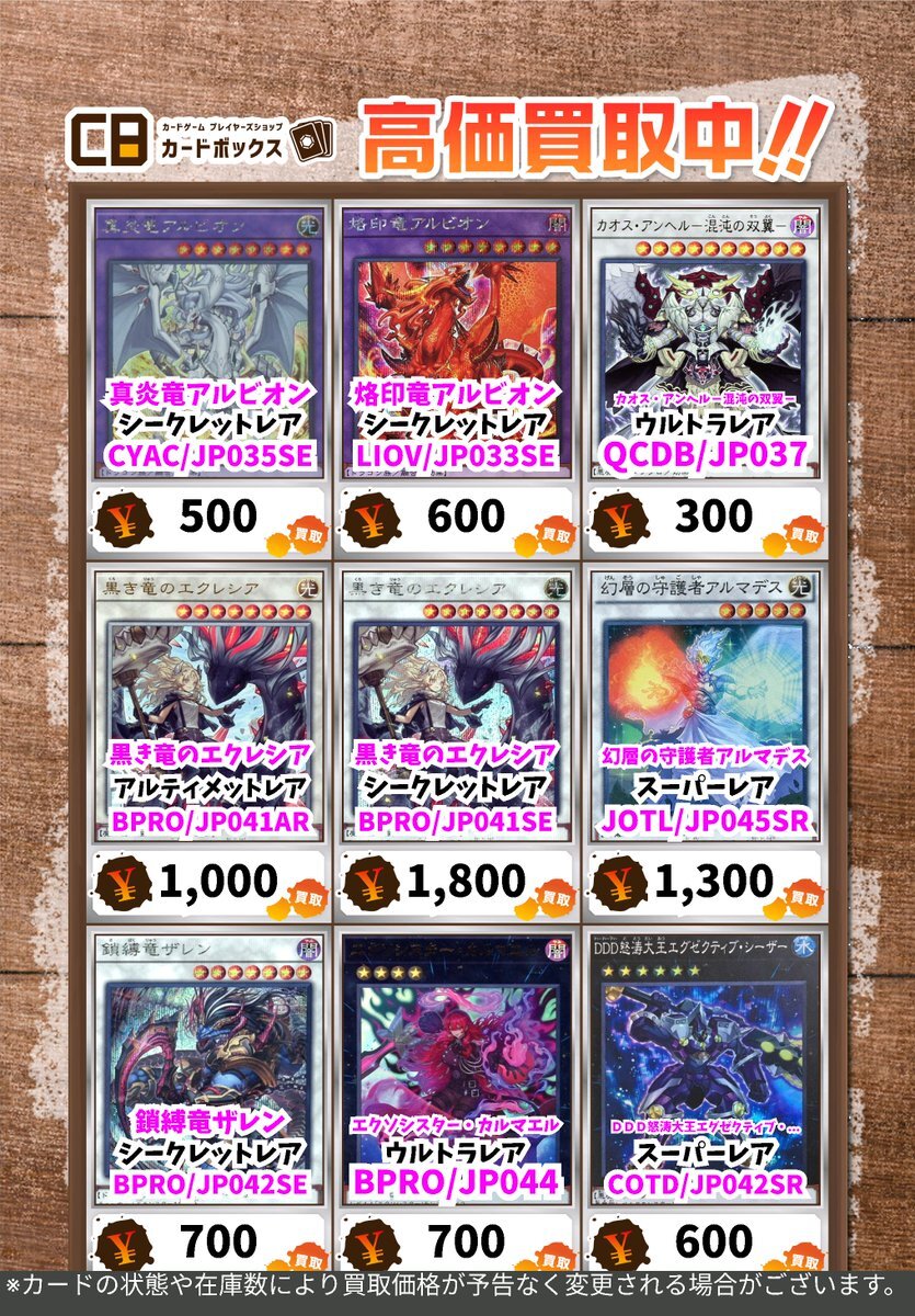 買取情報② ウィッチクラフトマスター・ヴェール 300 WAKE CUP! マキ 100 WAKE CUP! モカ 150 エクソシスター・マルファ 500 炎王妃 ウルカニクス 400 輝光竜セイファート 1,000 ギミック・パペット-ナイトメア 600 紅蓮王 フレイム・クライム 100
