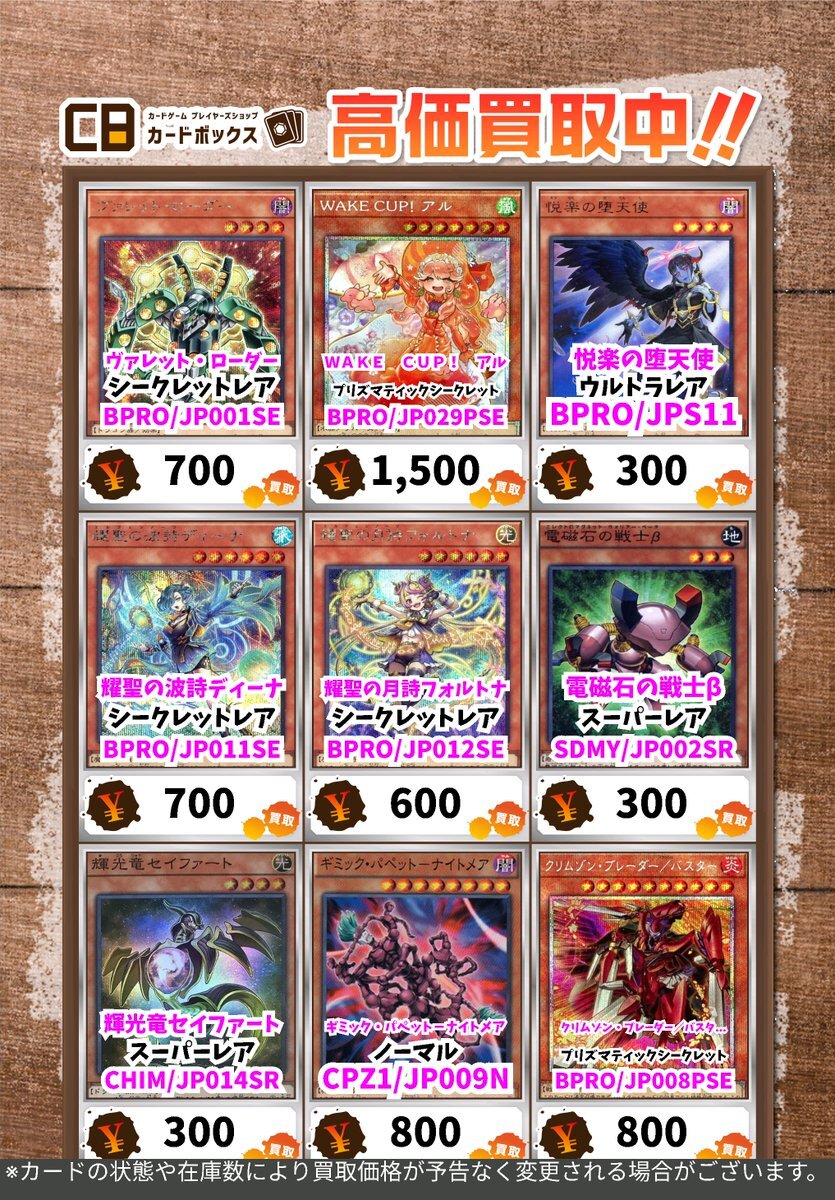 遊戯王買取情報! ヴァレット・ローダー シークレットレア 700  WAKE CUP! アル プリズマティックシークレット 1500  悦楽の堕天使 ウルトラレア 300  ※数量限定、美品での買取価格です #遊戯王 #カードボックス京都ファミリー店 #CB京都F買取情報 pic.x.com/gt9DyJ1lJP