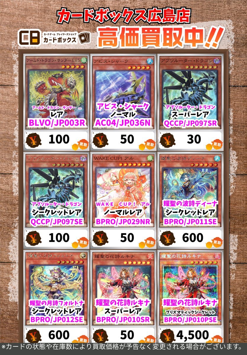 🔥🔥🔥遊戯王買取情報🔥🔥🔥 アームド・ドラゴン・サンダー LV5 レア 100  アビス・シャーク ノーマル 50  アブソルーター・ドラゴン スーパーレア 30  アブソルーター・ドラゴン シークレットレア 100  WAKE CUP! アル ノーマルレア 50  #遊戯王OCG #CB広島買取 pic.x.com/NmYEwQCK00