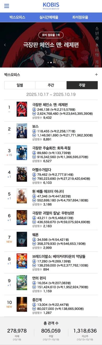 韓国映画週末興行成績 42週目(2025/10/17~2025/10/19) 1 劇場版『チェンソーマン レゼ編』(日) 2 ボス(韓) 3 劇場版総集編 呪術廻戦 懐玉・玉折(日) 4 仕方がない(韓) 5 ワン・バトル・アフター・アナザー(米) 6 劇場版 鬼滅の刃 無限城編(日) 7 WEAPONS/ウェポンズ(米) 8 pic.x.com/SUHz4tlQmP