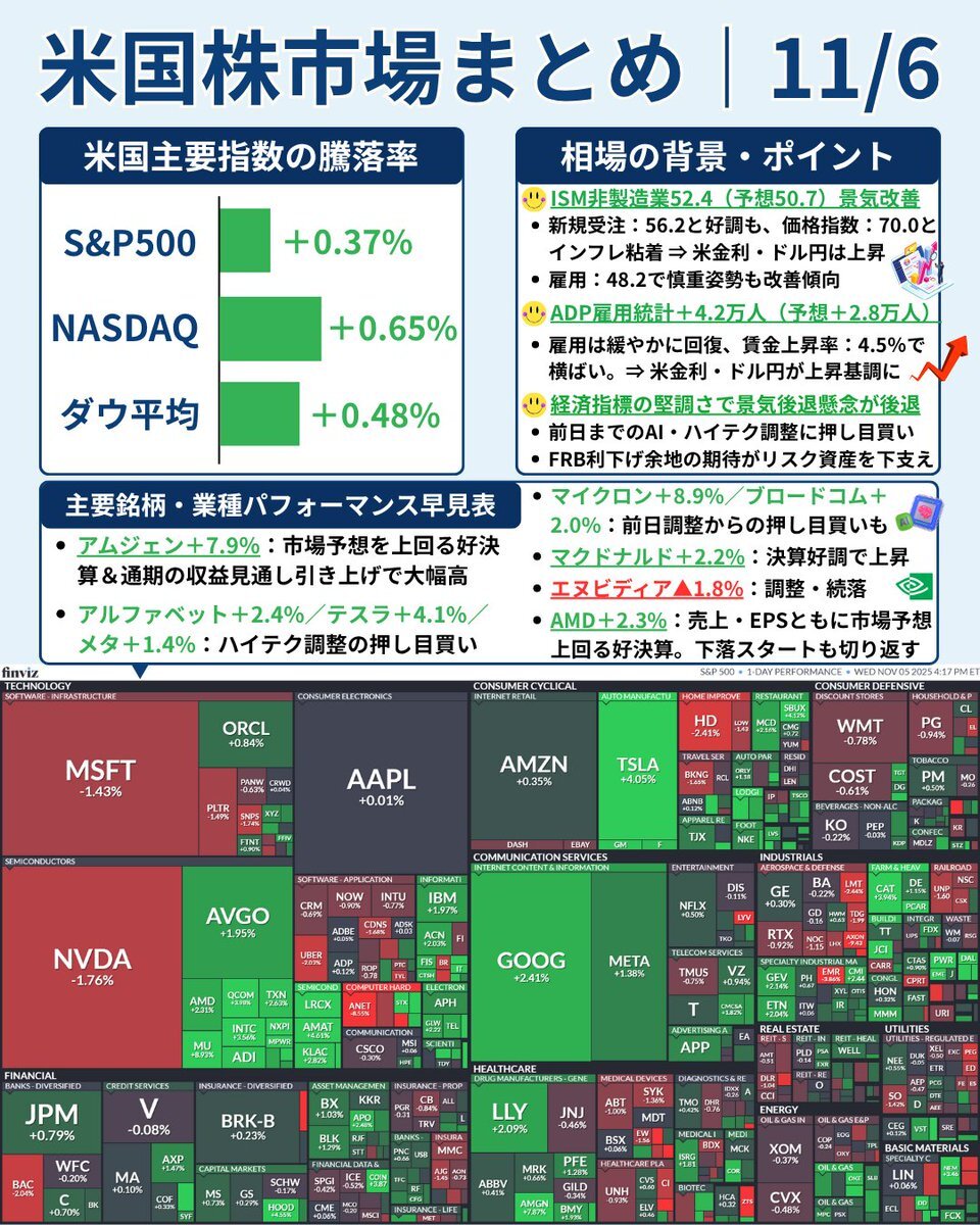 📘 #毎朝の相場まとめ|11/6(水) 米株は3日ぶりに反発📈 堅調な経済指標を受け、“割高調整”のムードが一服。 🇺🇸主要3指数 ・ダウ:+0.48% ・S&P500:+0.37% ・ナスダック:+0.65% 前日の下落から切り返し。 景気悪化への過度な懸念が和らぎ、買い戻しが優勢に。 📊支えとなった経済指標 x.com/t_ryoma1985/st…