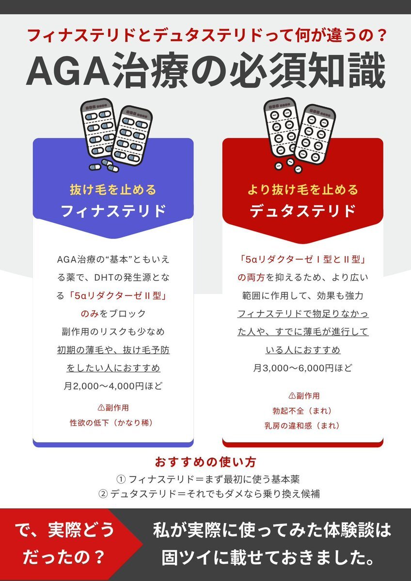 フィナステリドとデュタステリドって何が違うの? 【AGA治療の必須知識②】 フィナステリドとデュタステリドは、どちらもAGA(男性型脱毛症)の原因となるDHTというホルモンを抑える薬です。 しかし効果の及ぶ範囲・副作用の強さ・値段に差があります。 詳しくは表をみてください。 pic.x.com/IPnMSES9AO