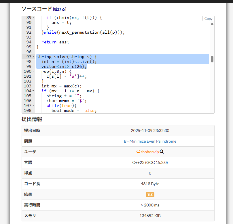 長さ26のvector<int>を関数の中ではなく外で定義して使い回すだけで >2000ms → 7ms になって意味不明 これのせいでただでさえ210位になるはずのところが337位になってさらにレートが削られるの最悪すぎる