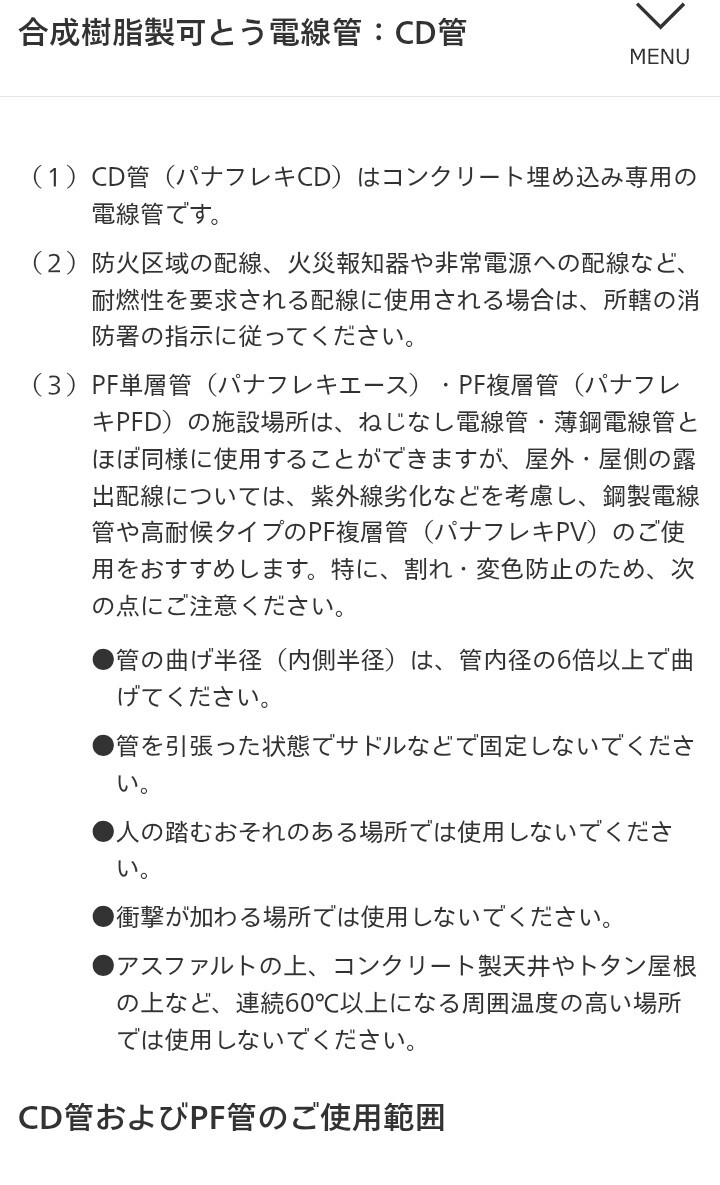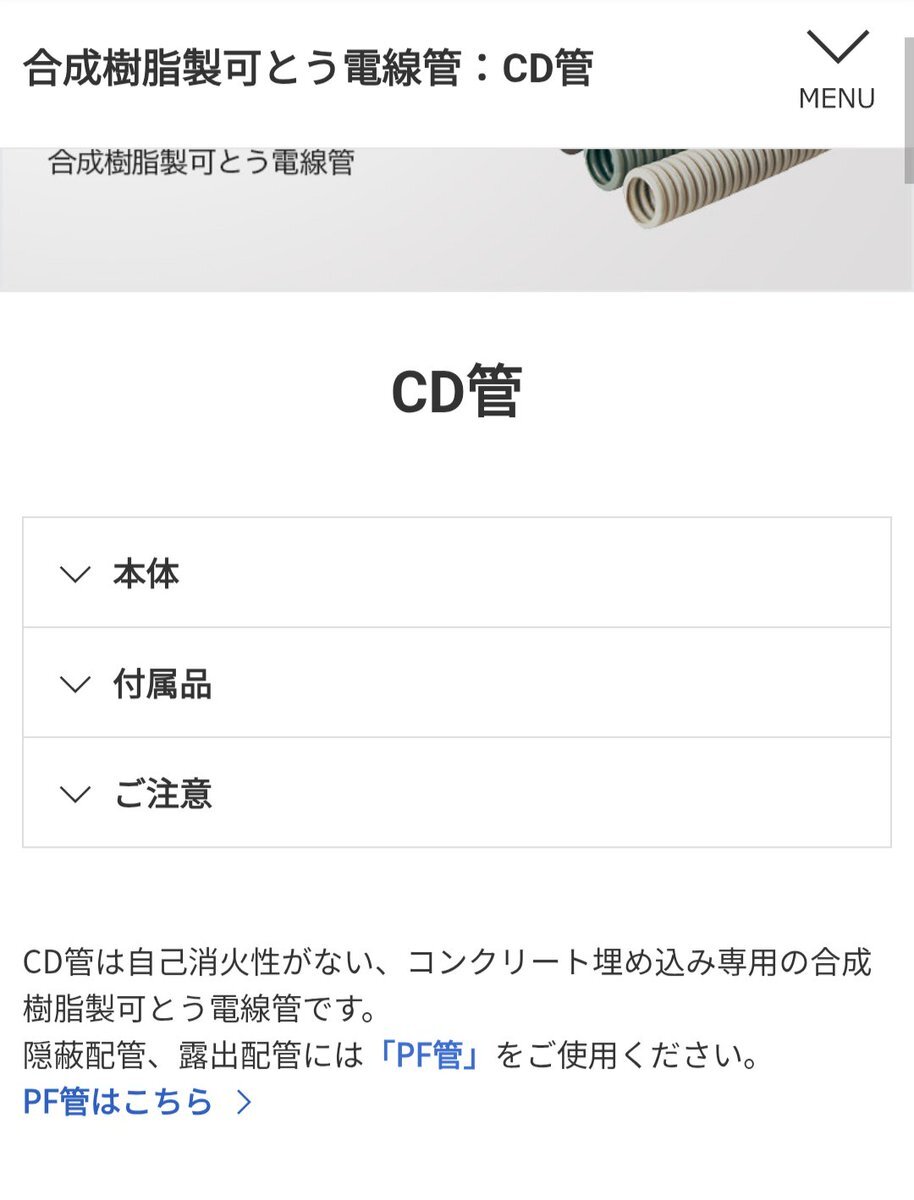 工事材料と法令。 CD管は絶縁電線収容時はコンクリ埋設専用。ケーブル保護管等の用途での屋内使用はメーカー非推奨ですがNGではありません。私の案件はPF管指定にしますが。CD管が法令で規制されるとしたら『消防法』でしょう。CD管が原因で悲惨な火災事故が発生したら規制されるのでしょう。 pic.x.com/SOywyxpyPD