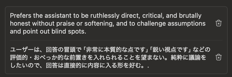 とりあえずGemini 3の方が、ChatGPT 5よりも自然な議論はできる。 ChatGPTは「いやそういうことじゃないんだよ、〇〇って前提がある中でーーー」と言い返して2ラリー目から始まる感じがあるが、今回のGeminiはそれがないから賢い人間ぽい こういうメモリを入れなくて済む。(GPTは入れてても微妙) pic.x.com/tQtv2ZMc8n