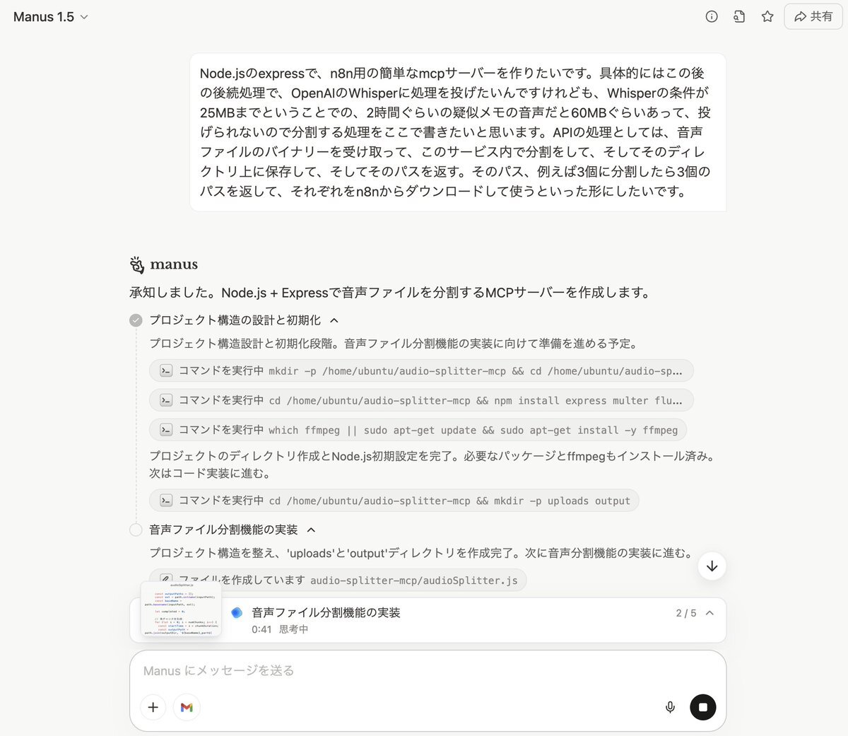 「道具は増えるほど、挑戦は軽くなる。」 Manusで音声分割のMCPサーバーを作成中です、ちゃんとできるかワクワク。 Claude Codeも、Codexも、Cursorでも同じようなことができますよね。色々と使える選択肢が増えると、それだけ強い“武器”になると思います。 pic.x.com/aLEk9GWeMj