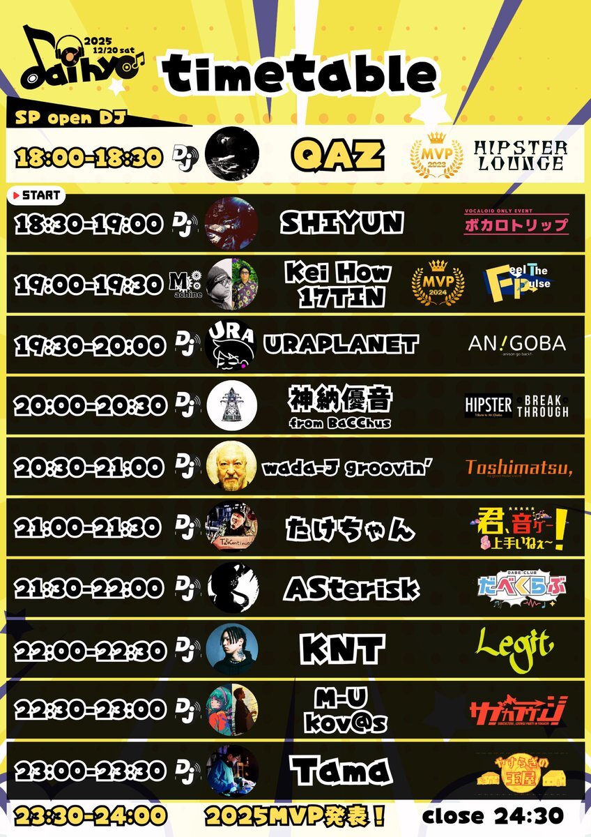 🎧12/20(土) -daihyo-2025 今年も開催致します⭐️ DJ&machineを対象に HIPSTERで 年に1回以上開催されている イベントから代表を選出‼️ まだオファーしたいイベントもあり、今後も楽しみですが 今回は昨年よりも拡大して 10つのイベントにオファー🎶 2025MVPは誰の手に❗️❔ #daihyo2025