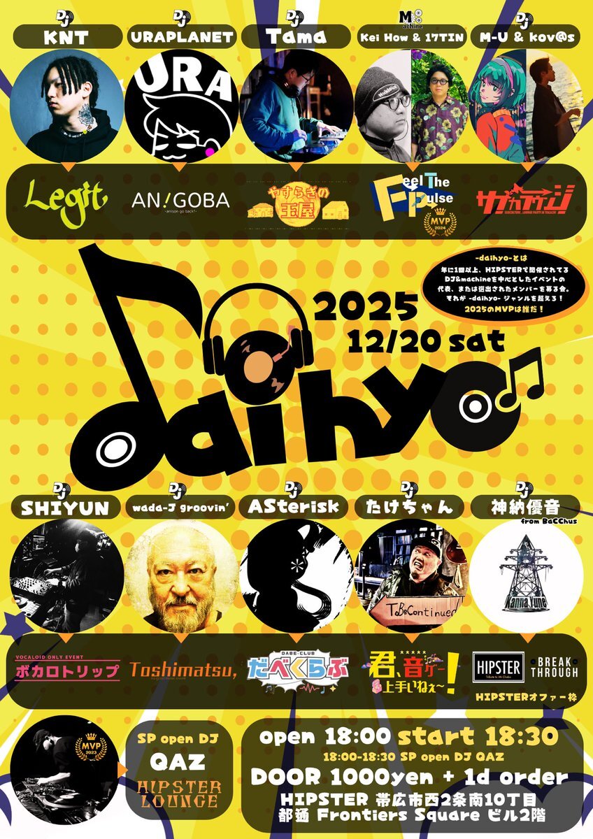 12月20日HIPSTERさんで DJ、マシンライブイベントの代表が出演するイベントDaihyoです! 僕は17TINさんと19時からの出演です! めちゃくちゃ熱いイベントなので 皆踊りましょう!!😊😊 #HIPSTER #帯広 #マシンライブ pic.x.com/C7Co3jA5x3