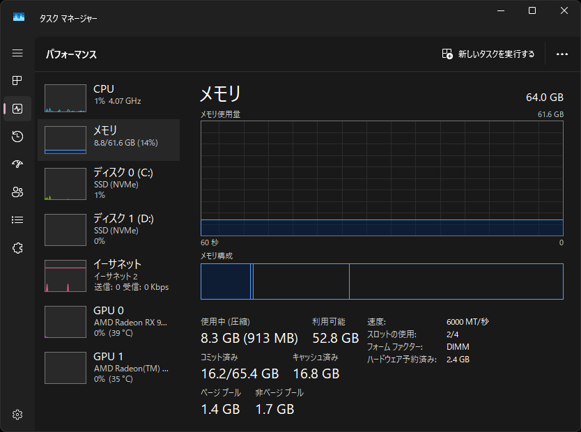 今年6月からDDR5-6400 32GB 2枚挿しの64GBを6000Mhzで運用! それまではDDR4-3600 16GB 2枚挿しの32GBだったけどまだ全然使えてる… pic.x.com/Ym3ZwN7VCY x.com/ZOTAC_JAPAN/st…