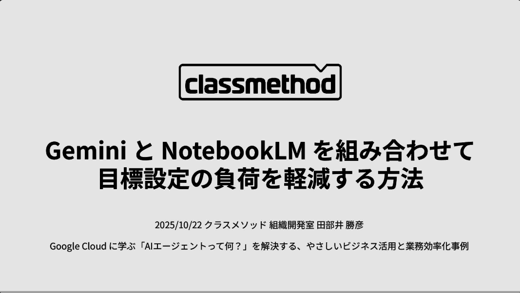 2025/10/27 - 2025/11/02 の発信 2025/10/28 【イベントレポート】『Gemini と NotebookLM を組み合わせて 目標設定の負荷を軽減する方法』の登壇と補足 dev.classmethod.jp/articles/goal-…