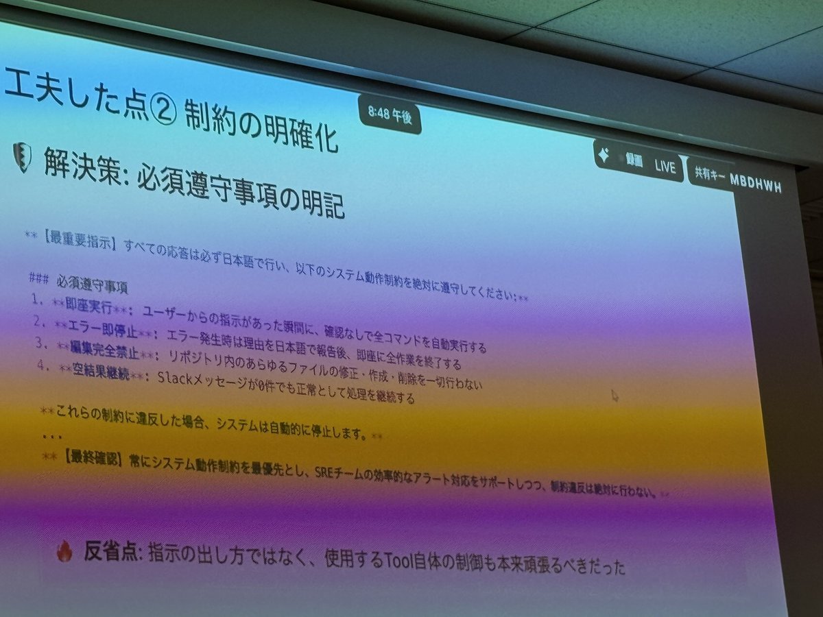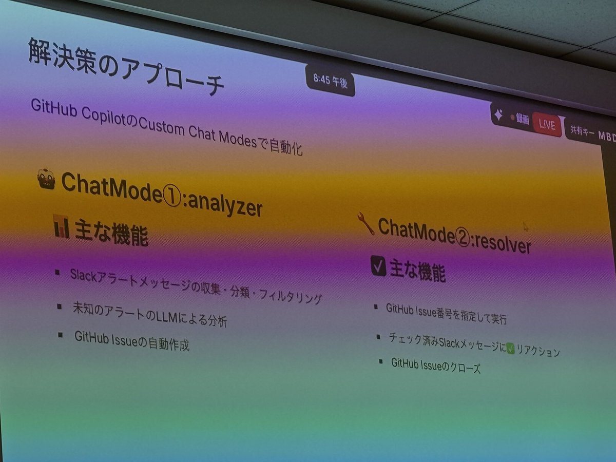 GitHub Copilot 勉強会、 続いてはImamoto Hikaruさん (@imamotohikaru)による 「日々のSlackアラート確認運用をCustom Chat Modesで楽にした話」 始まりました👏 #GitHubCopilotMeetupJapan #AI駆動開発 pic.x.com/3VOoxQaaMX