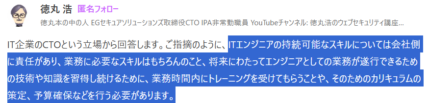 エンジニアの時間外勉強について、徳丸さんの考えをお伺いさせてください。 新卒で大手のsierに入社したのですが、経営層や組織の上の人たちが語る時間外の勉強や外部セミナーの参加の推奨に違和感を感じてしまいます。mond.how/ja/topics/1uhj…