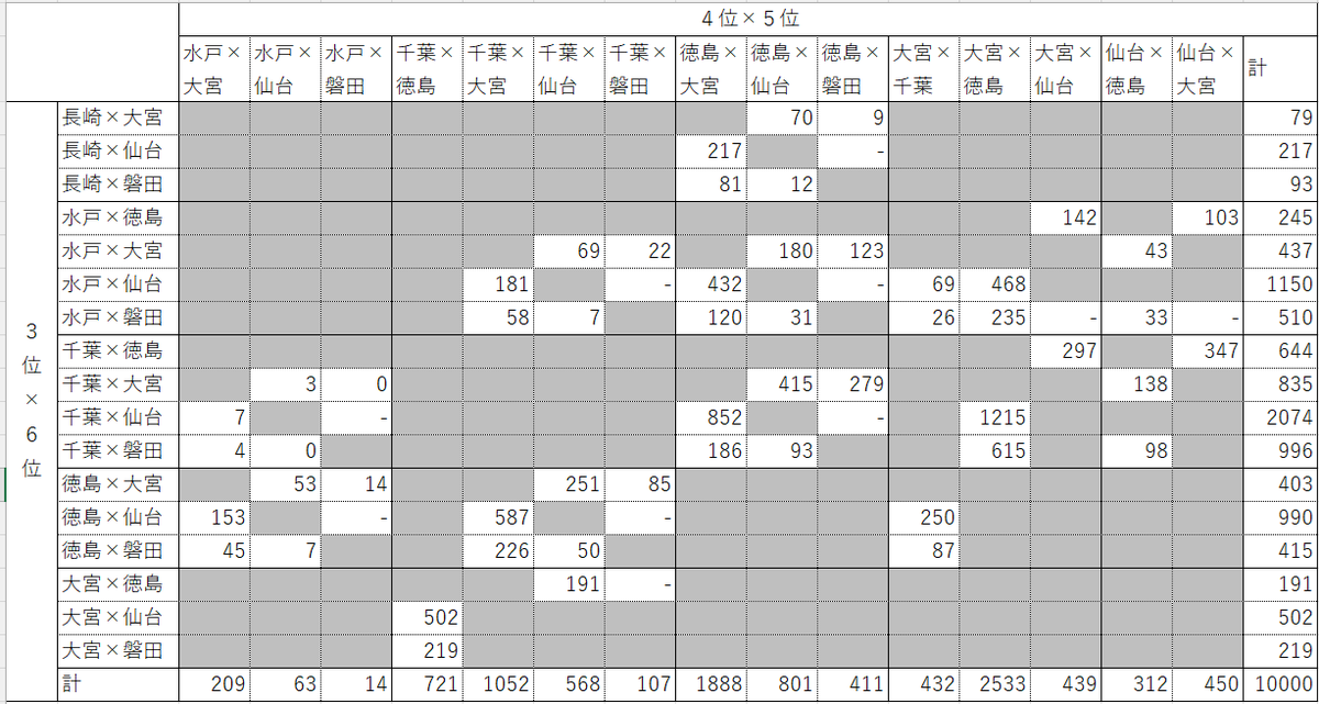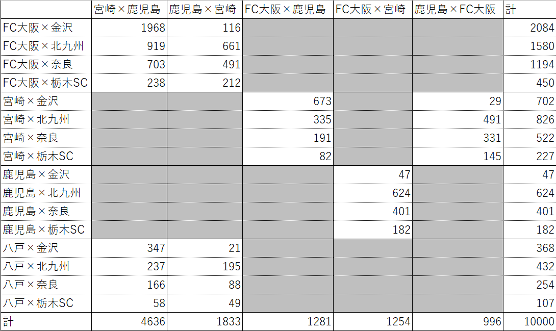 調子に乗ってJ1昇格プレーオフの組み合わせを10000回の試行に基づき出現頻度で集計した結果、J2昇格プレーオフ以上にカオスでした。 網掛けは想定されない、「-」はありうるが簡略化(4点差以上の試合が発生しないとする想定)のため出現の可能性がない、「0」はたまたま出現しなかった組み合わせです pic.x.com/alUO4a6qHQ x.com/imatochi/statu…
