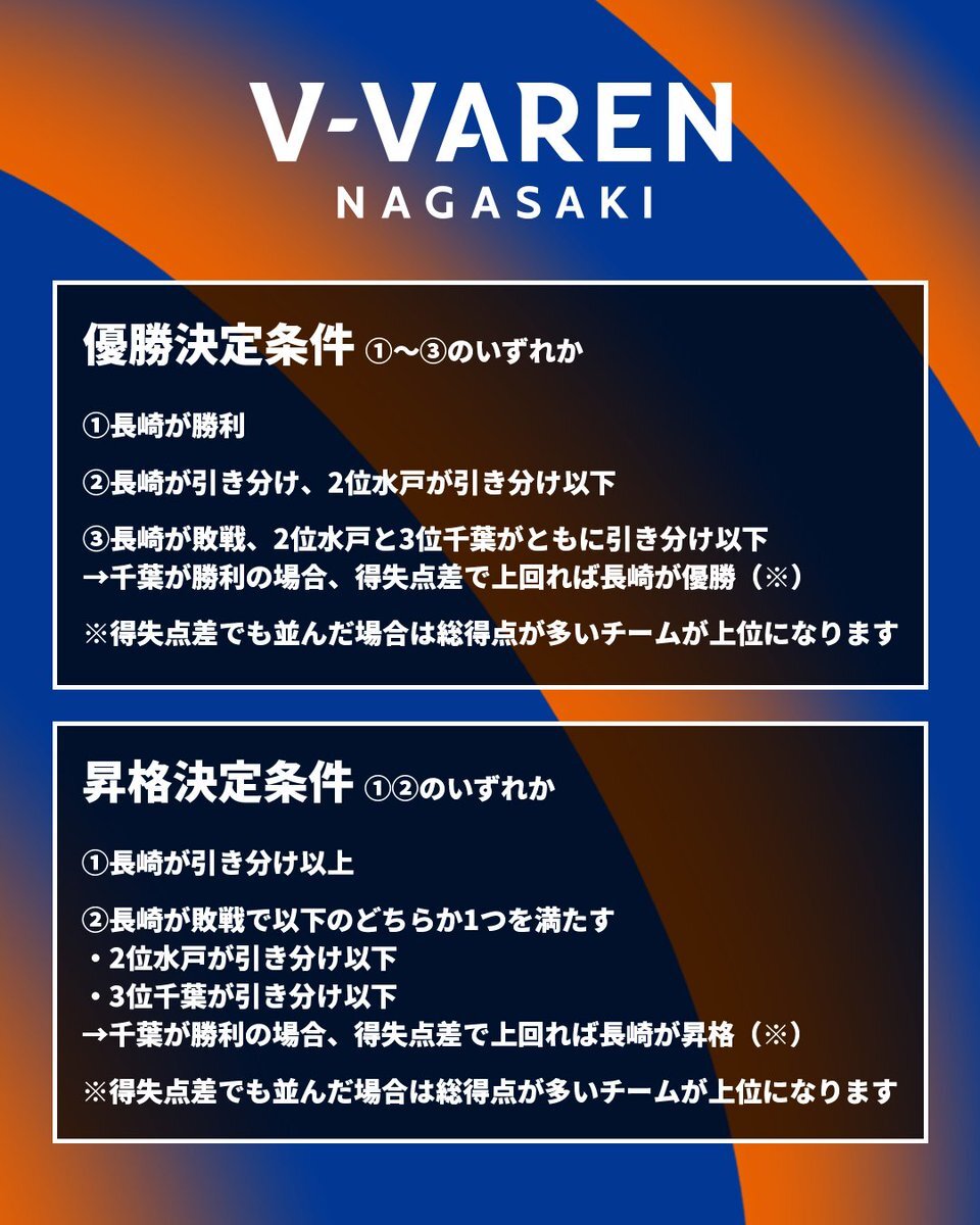 【V・ファーレン長崎のJ1昇格条件】 ①長崎勝利or引き分け ②長崎敗戦&2位水戸が引き分けor敗戦 ③長崎敗戦&3位千葉が引き分けor敗戦 ①〜③いずれかを満たせば確定 【徳島ヴォルティスのJ1昇格条件】 ①徳島が勝利 ②2位水戸が敗戦 ③3位千葉が引き分けor敗戦 ①〜③全てを満たせば確定 pic.x.com/LX8z1GmnTj