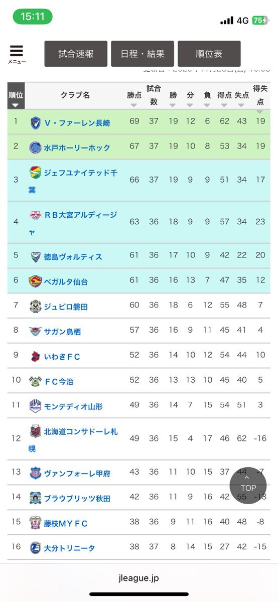 現在1位の長崎 J1昇格条件 徳島に勝利 他会場の結果関係なし 徳島に引き分け以上 他会場の結果関係なし 徳島に敗戦 2位水戸引き分け以下 3位千葉引き分け以下 いずれかを満たす 徳島に敗戦 2位水戸引き分け以下 3位千葉が勝利の場合 得失点差で上回る (現在、長崎+19、千葉+17)