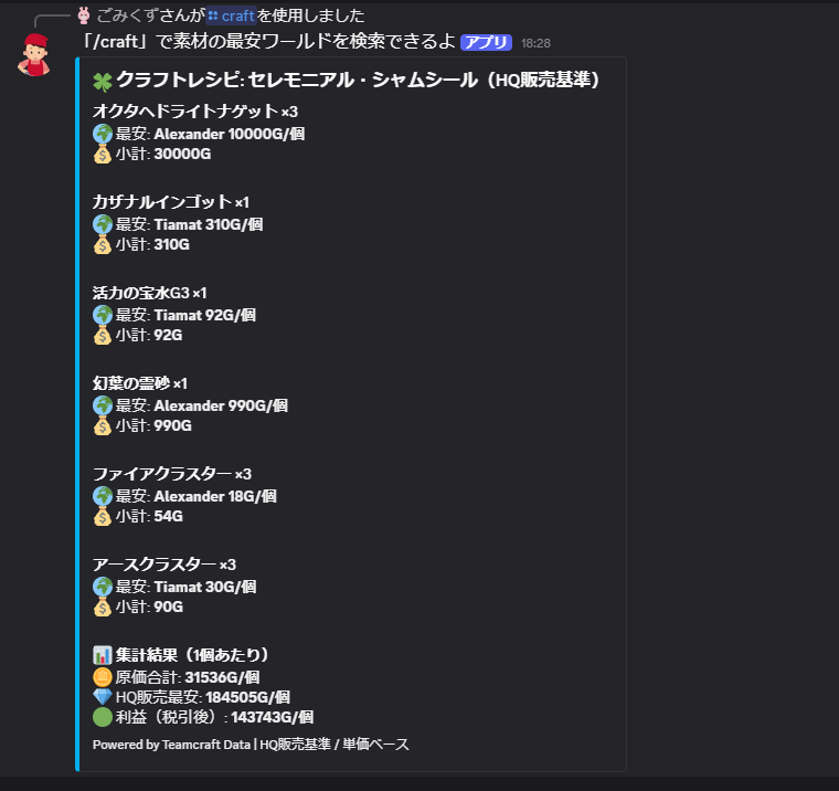 Teamcraft GitHubガチで役立った🫠 Teamcraft → 全レシピのJSON化 Universalis → 各素材/完成品の価格リアルタイム取得 Python側で → 整形+集計+利益計算 Discordで → コマンド1つで視覚的に出力 #FF14 pic.x.com/jlnd5nvLrR