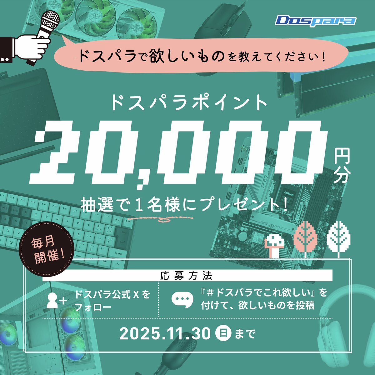 🍁ドスパラ11月のお買い物応援企画🍁 みなさんの『ドスパラでこれ欲しい』を教えてください! 抽選で1名様に 『ドスパラポイント20,000円分』が当たる🎁 / ご応募は✨ ①@dospara_web をフォロー ②#ドスパラでこれ欲しい をつけて欲しいものを投稿🍂 \ 11/30(日)迄📅