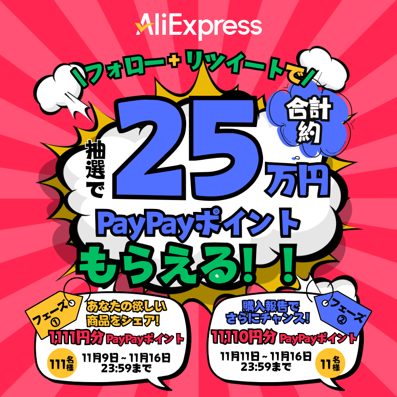 🌟アリエクの屋外広告登場記念🌟 街でもSNSでもアツい‼️フォロワーさん限定🎁 合計25万円分のPayPayポイントが当たるチャンス✨ 💬フェーズ①(11/9〜11/16) 欲しいアリエク商品を引用投稿(リツイート)で → 1,111円分 ×111名様🎯 🛒フェーズ②(11/11〜11/16) 11.11セール