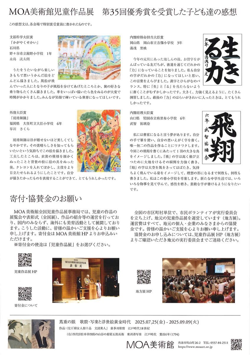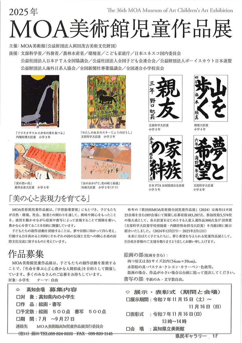 ―文化事業助成金助成事業― MOA美術館児童作品展が開催されます。 高知県内の小学生による絵画・書写の優秀作品の展示と表彰式です。 ◇展示:11月15日(土)13:00~11月16日(日)15:00まで 表彰式:11月16日(日)13:00~14:00 ◇入場無料 ◇高知県立美術館・県民ギャラリー acegn.moaart.or.jp pic.x.com/PCcsTLo5x9