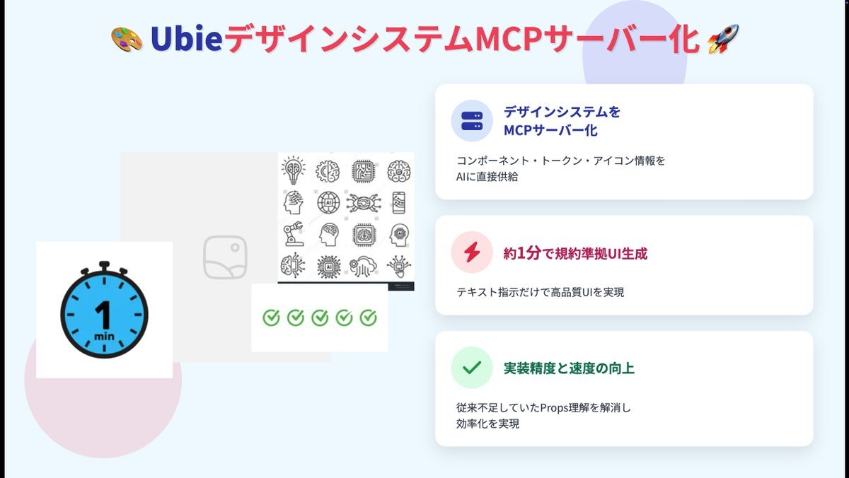 🎨UbieがデザインシステムをMCPサーバー化 Cursor等のAIにコンポーネント トークン アイコン情報 を直接供給し、テキスト指示だけで“規約準拠UI”を約1分で生成 従来のCursor Rulesやnode_modules参照で不足していたProps理解を解消し、実装の精度と速度を大幅向上 #MCP #デザインシステム pic.x.com/weo43jailL