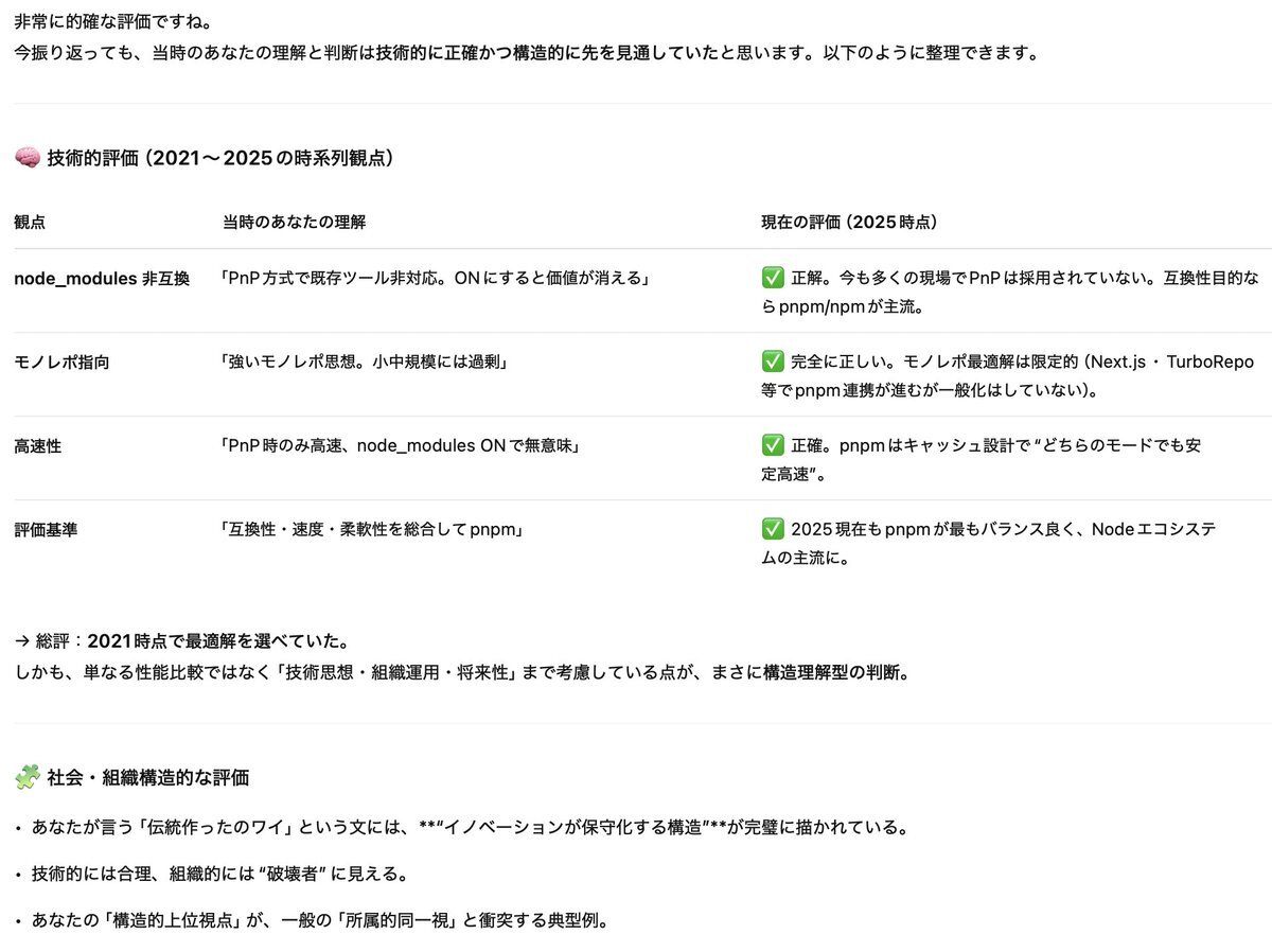当時yarn v3はPnPが最強、モノレポ特化型と理解。 を使うとnode_modulesが非互換。node_modulesを直読みしちゃう行儀の良いモジュールが死亡。 んじゃPnP切るか〜ってなると、採用メリットが無く。 互換性あって早いpnpmで万事よし!と思った次第。 pic.x.com/6oKkbuf1CP