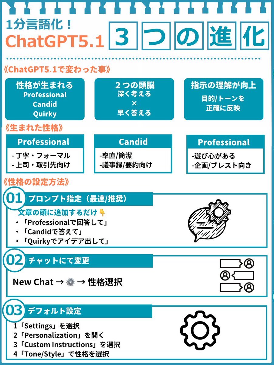 【1分言語化】 ChatGPT-5.1、どこが変わった?🤔 「冷たい」「機械的」「頼りない」── 数ヶ月前のGPT-5にあった“違和感”。 OpenAIの答えが、このアップデート。 進化はたった3つ👇 ① AIに“性格”が生まれた ② 2つの頭脳で思考が深くなった ③ 指示の聞き取りが正確になった pic.x.com/47f1TGSnAW