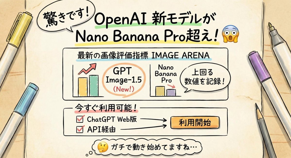 【画像生成】 🎨 OpenAI GPT Image-1.5: OpenAIの新しい画像生成AIがNano Banana Pro越え。Image ArenaにおいてGoogleのNano Banana Proを超えた数値を記録。ChatGPT WebアプリやAPI経由で使用可能。