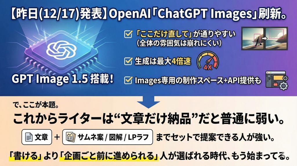 【昨日(12/17)発表】OpenAIが「ChatGPT Images」を刷新。 新しい画像生成モデル「GPT Image 1.5」搭載で、これ地味に革命。 ✅「ここだけ直して」が通りやすい(全体の雰囲気は崩れにくい) ✅生成は最大4倍速 ✅Images専用の制作スペース+API提供も で、ここが本題。 pic.x.com/kEjK30wIMP