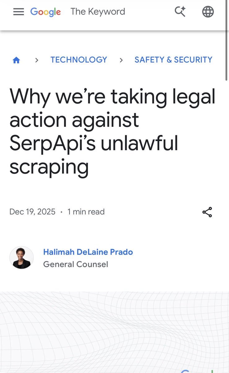 GoogleがSerpApiに対して訴訟を起こしたようです。 SerpApiはGoogleの検索結果をスクレイピングしてAPI経由で販売しており、過去の報道ベースでは顧客にOpenAI等が含まれていたため(現在もOpenAIがSerpApiを使っているかは不明。)、裁判の行方によってはChatGPT等に影響が出る可能性がありますね。 pic.x.com/ASatuAfrGE
