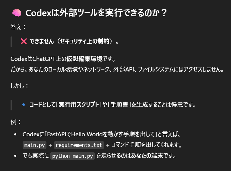 ちょっと待って、ChatGPT Codex は指示を出したら、コマンドプロンプトPythonなどの外部ツールを実行できるんですかAI →Codexは外部ツールを“実行する力”は持っていません →ここで混乱しやすい「Codexがやっていること」と「あなたがPCで行うべきこと」を、しっかり分けて整理します pic.x.com/2Vr17LOnn1