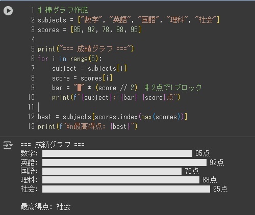 【情報1】文字で棒グラフを作る(13行) データを視覚化しよう📊 📚学べること: ・for文とインデックス ・文字の繰り返しでグラフ表現 棒グラフの完成例を参考にしてカスタマイズしてみよう✨ #情報1 #データ可視化 #Python #プログラミング初心者 pic.x.com/1o07TI47nq
