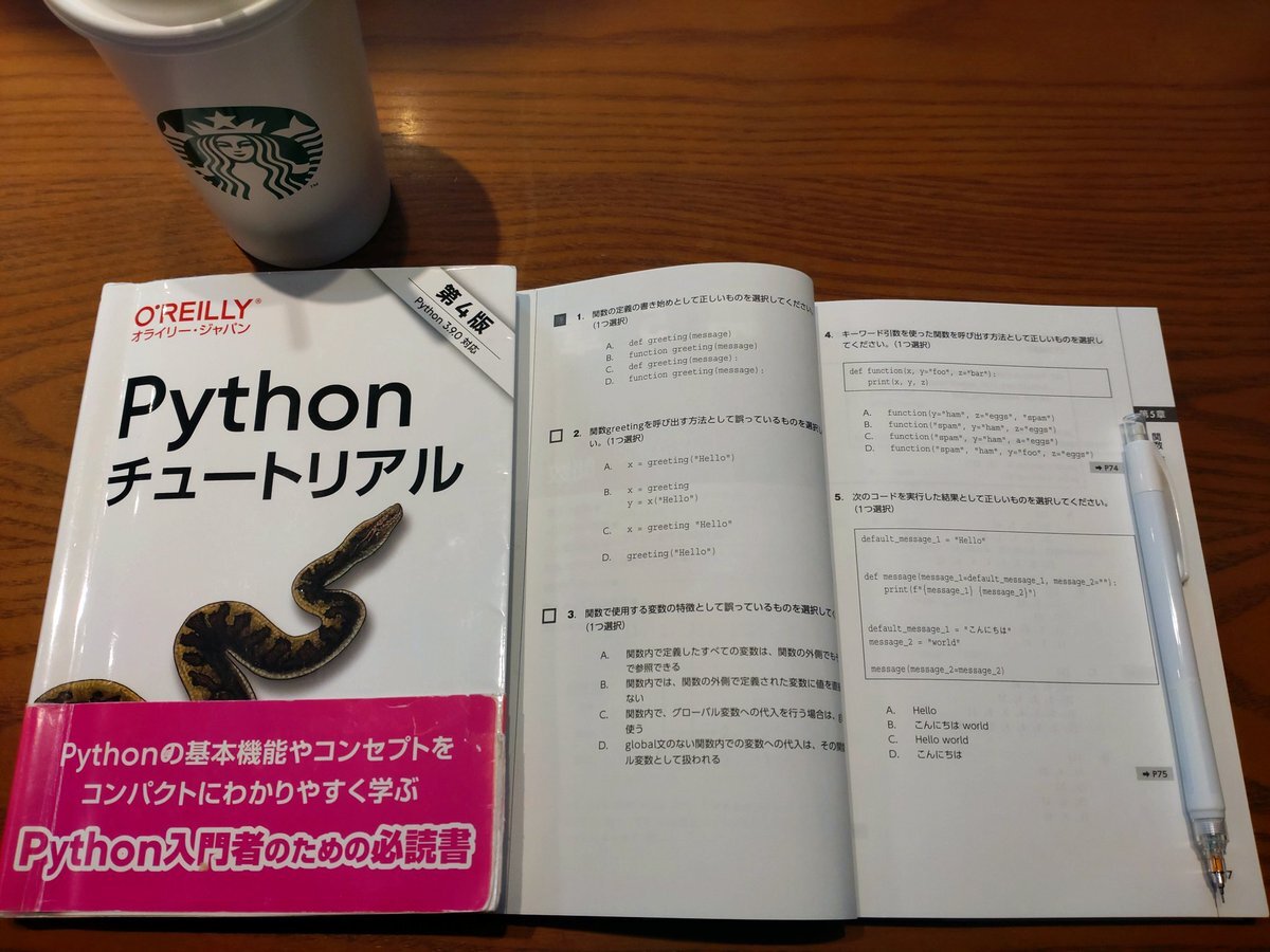 みなさん、資格勉強お疲れ様です。スタバでPython3エンジニア認定基礎試験の勉強をしています。公式問題集の問題を解いています。合格目指して頑張ります。宜しくお願いします。 pic.x.com/fLy1sVPGDW