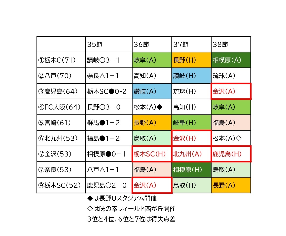 なんで5じゃなくて4なのかというと、プレーオフラインを挟んだ北九州・金沢の直接対決が残っているからです。なのでプレーオフ争いでは、順位表からではわからない事象が起こっています。たとえば、SC相模原は、あと1つ負けてもよさそうに見えますが、実際は次節金沢戦は引き分けでも即刻アウトです。