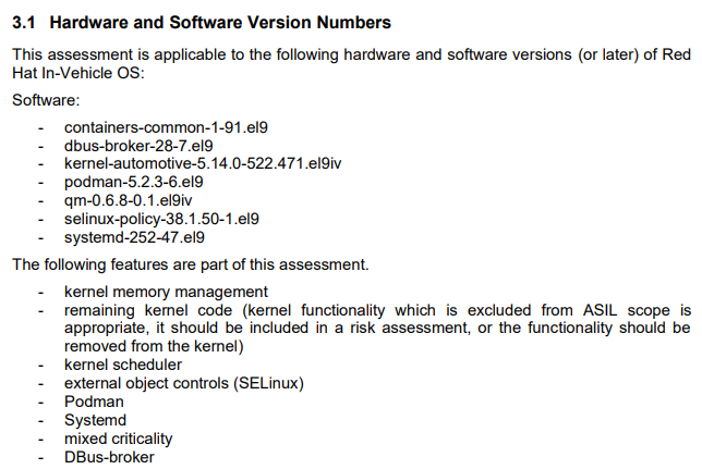 kernel、systemd、DBus、Podman、SELinux あたり全部 ASIL-B 通ってるんですか、これアツいし QNX はかなり不利になるんじゃなかろか……。instrument cluster とか ADAS の一部ぐらいだったら Linux 系のシステムが使おうとすれば使えるようになったってことですよね……? pic.x.com/clAV6gVPan x.com/orimanabu/stat…