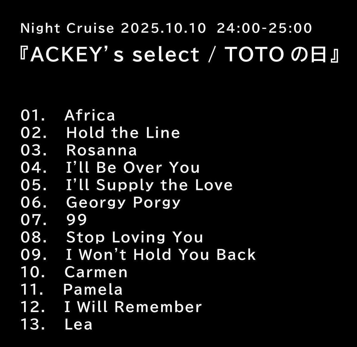 #NightCruise854 月曜日~金曜日 24:00 スタッフ選曲の音楽をお届けする1時間 10/8(金) 本日のプレイリスト 「ACKEY's select / TOTOの日」 #TOKYO854 #くるめラ FM85.4MHz PC·スマホ → fmplapla.com/fmhigashikurume @qurmela pic.x.com/rkfeVPtaBP