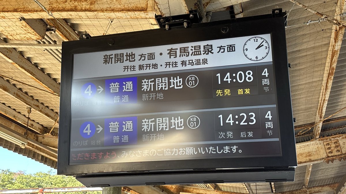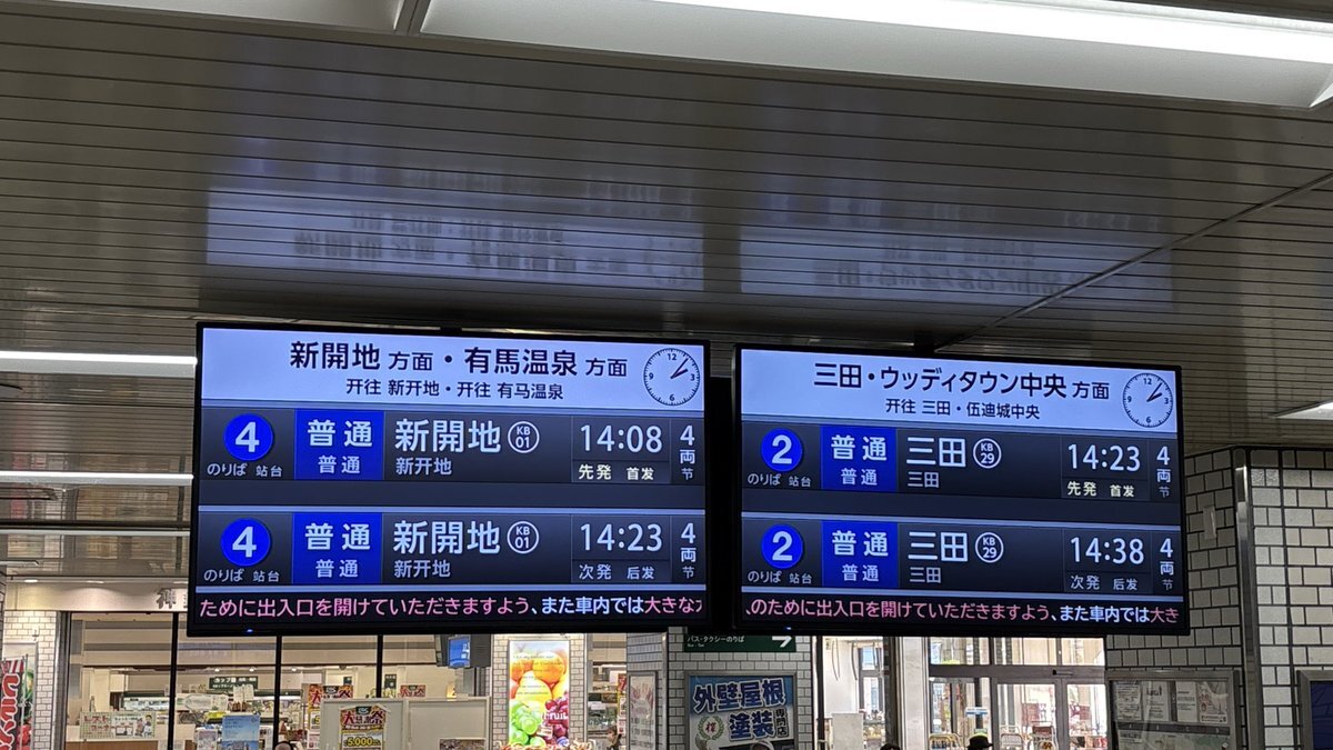 神戸電鉄三田線 田尾寺駅でブレーキ緩解しなくなったらしく、岡場〜道場南口間運転見合わせとなっています。岡場駅では新開地行きが全て2番線着→入換→4番線発(発車標見る限りでは)となっています。 pic.x.com/7tknOTixXl