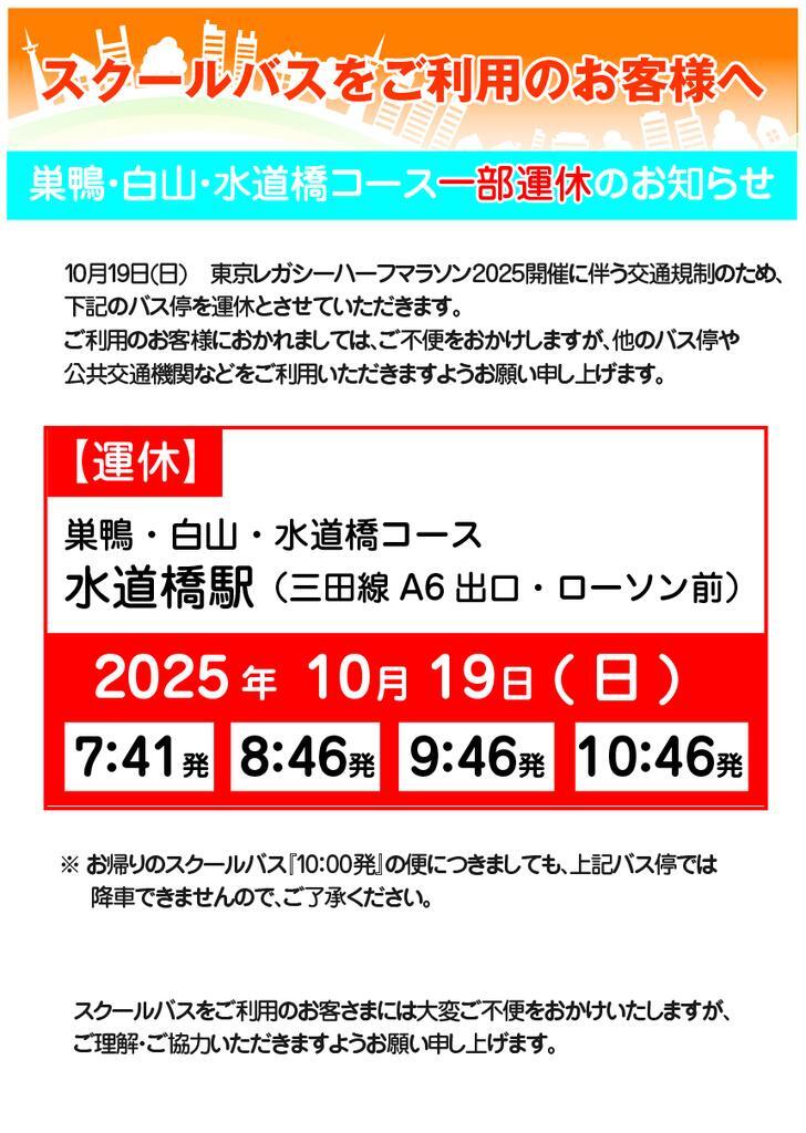 【🚌スクールバス運休情報】 10/19(日)東京レガシーハーフマラソン開催に伴う交通規制のため、 ●水道橋駅(三田線A6出口・ローソン前)バス停は 7:41・8:46発・9:46発・10:46発が運休となります。 ご利用のお客様には、ご不便おかけいたしますが、ご理解の程お願いいたします🙇♀️ pic.x.com/GNNqfhlc8z