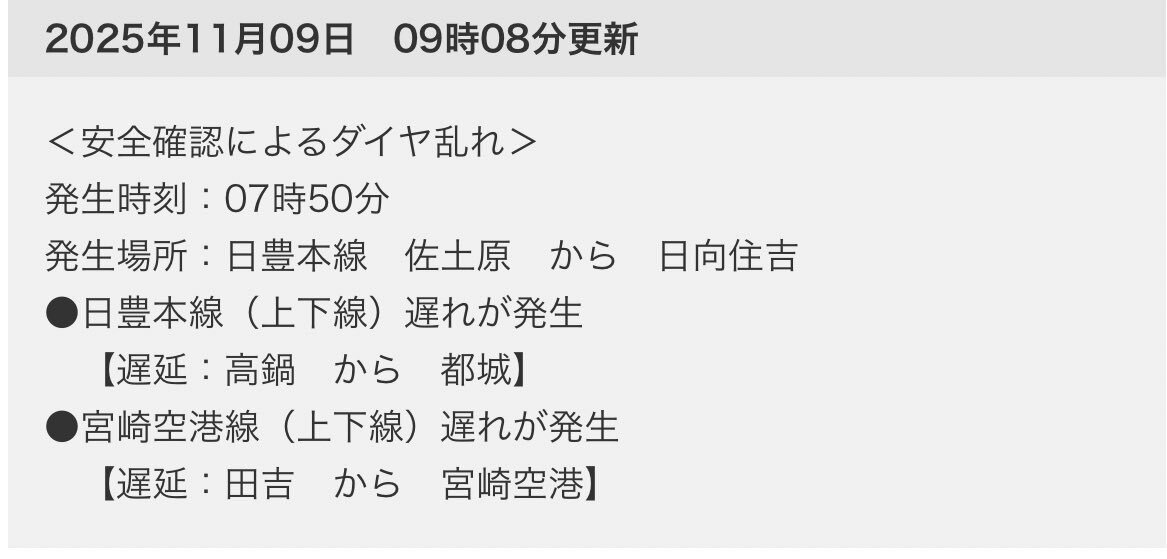 【宮崎 鉄道情報】 日豊本線の佐土原駅〜日向住吉駅の間であった安全確認の影響で、以下の区間で遅れが発生しています。 ご利用予定の方は十分注意を⚠️ ★遅れている区間 ▼日豊本線 高鍋駅〜都城駅 ▼宮崎空港線 田吉駅〜宮崎空港駅 #宮崎 #テゲバジャーロ宮崎 #ザスパ群馬 #鉄道情報 pic.x.com/zJv3ZbowXQ